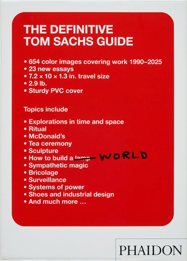 "A 21st-century creative force, Tom Sachs’s critically acclaimed practice spans sculpture, installation, painting, film, ceramics, and industrial design. The Tom Sachs Guide is the most comprehensive-to-date look at his work, documenting decades of rigorous and visionary artmaking. Vividly illustrated with more than six hundred and fifty images organized into thematic chapters, the book includes work across mediums, as well as longstanding collaborations with Nike and immersive reinterpretations of NASA missions. A rich appendix includes essential lists and charts, offering insights into the artist’s creative process and studio practice. An object direct from the hands of the artist, Tom Sachs Guide is a printed tour through his studio, his body of work, and the unique worlds he creates, designed and written in close collaboration with Sachs himself." A brand new example of this stylish, comprehensive monograph additionally SIGNED by the artist.