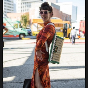 "The exhibitor Erin Schneider of the Llano del Rio Collective wears a Rose Mackey dress, No. 6 clogs and an accordion. "