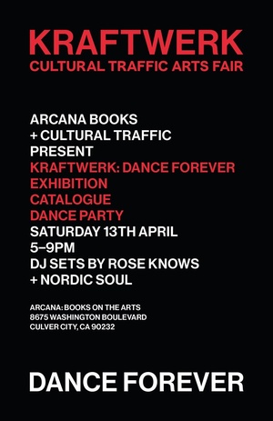 Come to Arcana: Books on the Arts at the Helms Bakery this Saturday evening (4/13, 5:00 - 9:00) to experience the West Coast premiere of "Kraftwerk: Dance Forever" – a graphically dazzling exhibition drawn from the Mott Collection of rare and compelling visual material from the German electronic music pioneers and those they influenced. Documenting Kraftwerk's aesthetic output from the early 1970s to the present, on display will be promotional material, sheet music, obsolete recorded media, posters, photos, and musical toys charting Ralf Hutter and Florian Schneider's highly influential machine music aesthetic, which inspired dance music and specifically Detroit Techno. The evening will feature Kraftwerk-themed musical sets by Rose Knows and Sean Horton, Kraftwerk shirts and bags designed by Arcana favorite Alex McWhirter, and Toby Mott signing copies of the limited edition catalogue to the show. If you cannot attend, place your order for a signed copy here!