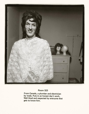 When Penny Wolin created Guest Register in 1975, she was twenty-one and a recent transplant to Hollywood from Cheyenne, Wyoming. You can see the residents of the St. Francis Hotel as people who could not fit in elsewhere, or you can see them, as Wolin does, as people whose dreams are bigger than their rooms. She moved into the 1920s hotel, a five-story pay-by-the week building on Hollywood Boulevard and began photographing her neighbors. She could see at once it was a “milieu of dreamers,” both those who “had not yet realized their dreams” and those who “had left them behind.” Wolin suspended judgement. She was not categorizing the residents as she made her rounds, and her project was not intended to fix anything. This generosity of spirit is the defining quality of Guest Register. The book is arranged as a tour, one image per spread, with residents identified by their room number and an insightful caption. The tour begins on the ground floor in room 105, vacated by the death of a former stuntman, and rises to a barbell aficionado in the penthouse, before returning to earth by way of an artisan welder in the basement, who seems to have lit his cigarette with a flaming torch. Guest Register is a both a culmination and a relaunch for an endeavor that is about the possibility of a second chance for all of us.