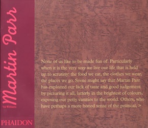 (PARR, MARTIN). Williams, Val.. London: Phaidon Press Ltd., 2002. First Edition. Small Oblong Folio. 1/4 Linen Over Boards. Photography Monograph. As New/No Jacket - As Issued. 352pp, profusely illustrated in color and b&w. With a comprehensive bibliography and exhibition history. This is a massive, cheerfully obsessive tome documenting Parr's life and career; revealing insights into his influences and attitudes as well as assessing his importance within the worlds of art & photography. Parr's wry commentary on British life and social mores has continued for over thirty years, becoming increasingly global in nature. Images presented here from previous bodies of the Magnum photographer's work and publications include "A Fair Day", "Bad Weather", "Home Sweet Home", "Autoportrait", "The Last Resort", "The Cost of Living", "Signs of the Times" and "Think of England"; in addition to many as yet uncollected in book form. A brand new, pristine example of the 2002 first Phaidon hardbound edition (cited on page 249 of Fred Ritchin and Carole Naggar's "Magnum Photobook: A Catalogue Raisonné") still in the publisher's shrinkwrap. 0-7148-3990-6 Inventory Number: 018038