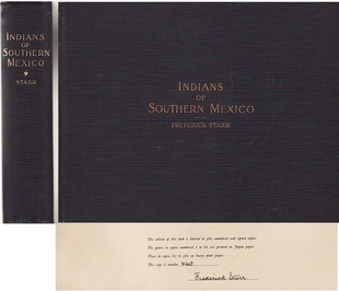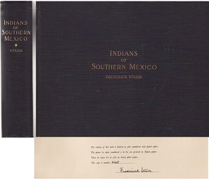 (LANG, CHARLES B.). Starr, Frederick. Chicago, IL: Printed for the Author by the Lakeside Press, 1899. First Edition 1/560. Oblong Small Folio. Gilt-Debossed Cloth in Jacket. Photography Monograph. Very Good -/No Jacket. xxxii + cxli (350pp), 141 monochrome gravure illustrations. "Indians of Southern Mexico: An Ethnographic Album" is Frederick Starr's beautifully illustrated ethnographic survey of the indigenous peoples of the southern states of Mexico at the close of the nineteenth century. It was printed for the author in 1899 utilizing letterpress and gravure in an edition of five hundred and sixty copies only at Chicago's fabled Lakeside Press. Reproducing photographers Charles B. Lang and Bedros Tartarian's albumen images from the author's 1896 and 1898 expeditions amongst the Aztec, Chontal, Cuicatec and Chinantec, Juave, Mixe, Mixtec, Otomi, Tarascan, Tehuantepecano, Tlaxcalan, Triqui, and Zapotec tribes along with a descriptive text, to this day it remains a standard work in the field. A handsome copy of this elegant tome NUMBERED (440/560) AND SIGNED "Frederick Starr" in black ink on the front colophon, as issued, showing only minor wear to the extremities and tips of its still bright, navy blue gilt-debossed cloth along with a few insignificant surface abrasions to the front and rear boards. With one hundred and forty-one photographic plates and weighing nearly eleven pounds, this title's binding and hinges are notoriously fragile. The massive textblock exhibits some typical play and slight pulling to the signatures, however it remains remarkably sturdy given its age and weight. The rear hinge is well preserved but for two small starts, with the front hinge revealing some separating along its length that has been securely repaired using archival adhesive without the need for reinforcement. The endpapers and edges show light wear and soiling, while the plates are bright and crisp with the occasional minor blemish to the margins. This particular example from the edition of five hundred impressions on "heavy plate paper" was exhibited in the 1993 Museum show "Mexico Through Foreign Eyes: 1850-1990" curated by Carole Naggar and Fred Ritchin, and is reproduced in its comprehensive catalogue published by W.W. Norton. All in all, it is a spectacular age-appropriate copy of this exceptionally striking and important Mexican ethnography. PLEASE NOTE: Additional shipping costs are required for this item beyond our standard rates due to its weight and value - we will inform you of the applicable amount at time of purchase. Inventory Number: 019354