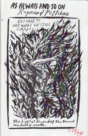 RAYMOND PETTIBON: AS ALWAYS AND SO ON  (PETTIBON, RAYMOND). Pettibon, Raymond & Josh Bayer. NP: Raymond Pettibon, 2006. First Edition 1/450. 8vo. Stapled Illustrated Wrappers. Artist's Book. As New.. np (34pp), 26 b&w illustrations. In a protective clear acetate dustwrapper. Raymond Pettibon first came to prominence during the late-seventies with his raw, literary-inflected imagery for Black Flag, Sonic Youth, and SST Records. Over the subsequent decades, the erstwhile Southern California artist has deservedly become an international contemporary art icon. Limited to four hundred and fifty copies, "As Always and So On" is his 2006 self-published artist book cum 'zine in the time-honored DIY, xeroxed format of his earlier, self-published works. It is populated with images of Raymond, Che Guevara, Batman and Robin, Stalin, Ronald Reagan, Jughead, Nat King Cole, and even the Holy Bible! A brand new, pristine, guaranteed authentic example of this exceedingly uncommon Pettibon tour de force HAND NUMBERED in black ink by the artist on the front cover, as issued. Limited to four hundred and fifty copies only, this recent Raymond Pettibon artist's book is in the time-honored DIY, xeroxed format of his earlier, self-published works. It is populated with images of Raymond, Che, Batman and Robin, Stalin, Ronald Reagan, Jughead, Nat King Cole, and even the Holy Bible! A pristine copy hand numbered and with the artist's chop, in the publisher's plastic sleeve, as issued. Inventory Number: 020780