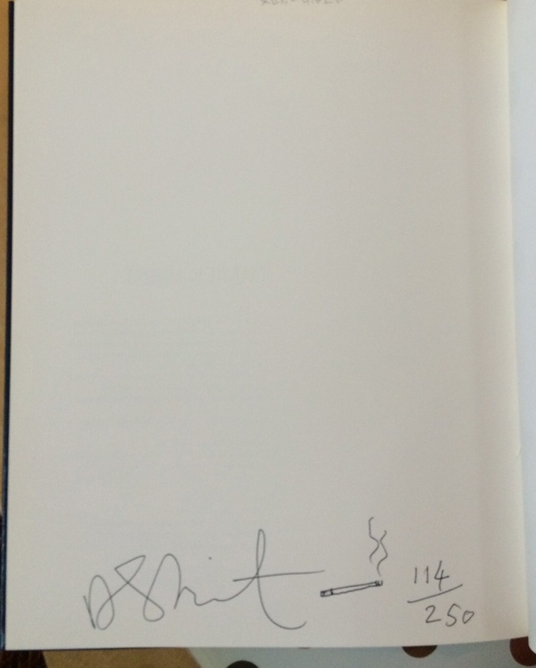 (HIRST, DAMIEN). Hirst, Damien, Iwona Blazwick, Charles Hall & Sophie Calle. London: Institute of Contemporary Art & Jay Jopling, 1991. First Edition 1/250 Deluxe. Small 4to. Debossed Leather Over Boards. Artist Monograph. Fine/No Jacket - As Issued. np (64pp), profusely illustrated in color and b&w. Designed by Form, London. In a protective clear acetate dustwrapper. This is the catalogue issued on the occasion of Damien Hirst's tour-de-force 1991 Institute of Contemporary Art London exhibition - the enfant terrible of the New British Art scene's very first one-man museum presentation. The first monographic publication on his work, this elegant document reproduces each of the exhibited butterfly paintings, dot paintings and glass vitrine pieces, and includes a transcribed interview between Hirst and Sophie Calle. A brand new, most handsome example from the exceedingly uncommon deluxe edition bound in full dark blue leather-over-boards debossed with yellow lettering limited to two hundred and fifty copies NUMBERED (114/250) AND BOLDLY SIGNED "Damien Hirst" additionally WITH A DRAWING of a smoldering cigarette in black ink on the verso of the last page. 0-905263-53-7 Inventory Number: 021554