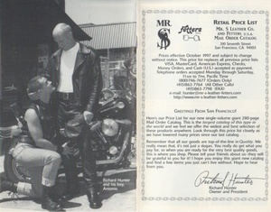 (MR. S LEATHER COMPANY) (FETTERS USA). Hunter, Richard. San Francisco: Mr. S Leather Company, 1997. Edition Not Stated - Presumed First. 8vo. Stapled Printed Wrappers. Fashion Trade Catalog. Fine.. 26pp, 23 b&w illustrations. Published in 1997, this is the updated retail price list supplement to the previous two hundred and eighty page catalog for noted San Francisco purveyors of accoutrements for the leather clad, fetishized, butch gay male lifestyle - Mr. S Leather Company and Fetters USA. A most handsome copy. Inventory Number: 021699