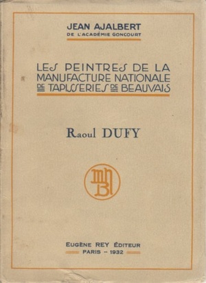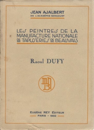 (DUFY, RAOUL). Ajalbert, Jean. Paris: Eugene Rey Editeur, 1932. First Edition 1/1200. 12mo. Printed Wrappers. Decorative Art Monograph. Very Good -.. np (32pp), 10 b&w illustrations. Text in French. In a protective clear acetate dustwrapper. This 1932 installment of Eugene Rey Editeur's series "Les Peintres de la Manufacture Nationale des Tapisseries de Beauvais" is devoted to the collaborative screens and chairs of the early thirties by noted artist Raoul Dufy and Parisian decorator Andre Groult. An internally most handsome example of this exceedingly uncommon item showing some light wear, soiling, and a nick to the wrappers along with a previous owner's name in ink on the inside front cover. It has been priced accordingly. Inventory Number: 022599
