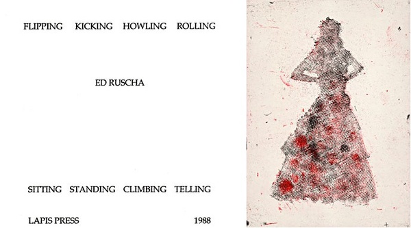(RUSCHA, EDWARD). Ruscha, Edward. Los Angeles: The Lapis Press, 1988. First Edition 1/35. Elephant Folio. Full Leather in Slipcase. Artist's Book. Very Good/No Jacket - As Issued. np (28pp), 1 letterpress colophon + title page, 8 color etchings. In a protective clear acetate dustwrapper. "Flipping, Kicking, Howling, Rolling, Sitting, Standing, Climbing, Telling" is the oversized, extraordinarily luxe artist's book published in 1988 by Sam Francis' Lapis Press containing eight original etchings by Edward Ruscha. Each "silhouette" image was pulled by master printer Jacob Samuel at The Litho Shop on a 20 x 16" sheet of Rives BFK paper. The title and colophon pages are printed by hand-letterpress, and along with the etchings, four blank preliminaries, and endpapers have been hand-bound by Klaus Ullrich S. Rotzscher in an exquisite debossed, full dark green smooth calfskin. The book is housed in a stylish matching calf and linen slipcase. An internally most handsome example of the first and only printing (print entries 149-156 in Siri Engberg's "Edward Ruscha: Editions 1959-1999") of this exquisite, exceedingly uncommon volume - only two copies are currently cited in OCLC WorldCat - BOLDLY NUMBERED (35/35) AND SIGNED "Ed Ruscha 1988" in pencil on the rear colophon, as issued, showing some very mild wear to the front and rear boards along with some rubbing and slight discoloration to the leather spine. The slipcase bears some rubbing and abrading to the leather trim at the heel and crown of the opening along with some minor wear to the linen along the seam of the bottom edge. It has been priced accordingly. This is accompanied by a pristine example of the hors commerce 20 x 16" Lapis Press promotional broadside cum print for the book featuring a colored etching by Ruscha of the letter "B" (entry M-59 in Siri Engberg's "Edward Ruscha: Editions 1959-1999") that was issued in an edition of forty numbered but unsigned copies. Inventory Number: 024157