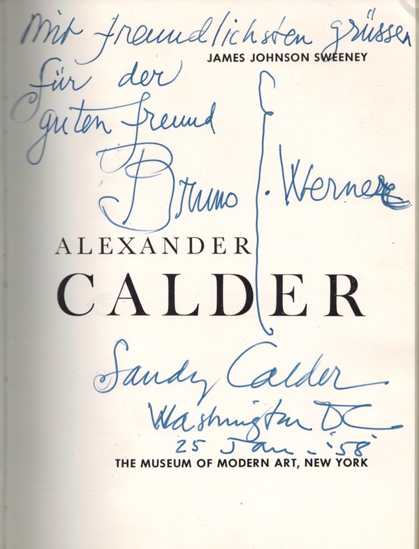 (CALDER, ALEXANDER). Sweeney, James Johnson. New York. 1943 (1951).: Museum of Modern Art. Second Edition. Small 4to. Illustrated Boards in Jacket. Artist Monograph. Very Good -/Very Good -. 80pp, profusely illustrated in b&w. With a chronology, exhibition history, collections listing, filmography and bibliography. This is the catalogue first published in conjunction with the Museum of Modern Art's comprehensive 1943 Alexander Calder retrospective exhibition. It features a text by curator James Johnson Sweeney accompanied by reproductions of sculpture, mechanized works, mobiles, stabiles, drawings, jewelry, previous gallery installations, and more. A most presentable example of the 1951 hardbound printing additionally bearing the BOLDLY SIGNED PRESENTATION "Mit freundlichsten grussen / fur der / guten freund / Bruno E. Werner / Sandy Calder / Washington D.C. / 25 Jan, '58" in his inimitable script in blue ink across the entire title page showing some overall wear to the book and its dust jacket as well as a mild dent through the upper foredge tip of the boards and textblock. Bruno Walter was a well-known German writer, art critic, and diplomat who served as his country's cultural attaché in Washington from 1952 through 1961. The date of the inscription coincides with the January 25th, 1958 opening of the artist's one-man exhibition as the twenty-seventh installment of the Corcoran Gallery's "Contemporary American Artists Series". Inventory Number: 024455