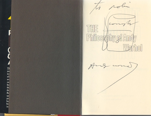 (WARHOL, ANDY). Warhol, Andy & Bob Colacello. New York: Harcourt Brace Jovanovich, 1975. First Edition. 8vo. Cloth Over Boards in Jacket. Artist Autobiography. Fine/Near Fine. 242pp, no illustrations. Dust jacket design by Herb Lubalin with a photograph by Philippe Halsman. "The Philosophy of Andy Warhol (From A-B & Back Again)" is the charming 1975 confessional autobiography cum successful artist's instruction manual penned by Andy Warhol with the assistance of Pat Hackett, Brigid Polk and Bob Colacello. It combines the Pop Art titan's ephemeral musings and concrete business suggestions intertwined with hilarious transcribed excerpts from his ever-present daily telephone calls. A most handsome example of the stated first edition, first printing (showing the letter A struck from the printing history) of this inspirational and aspirational tome in a neatly price-clipped dust jacket additionally bearing a BOLDLY DRAWN CAMPBELL'S SOUP CAN DRAWING WITH A SIGNED PRESENTATION "to robin / Andy Warhol" in black marker across the half title page to an artist that acquired this directly from Mr. Warhol while visiting The Factory for tea in the seventies. 0-15-189050-1 Inventory Number: 024541