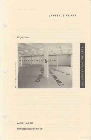 (WEINER, LAWRENCE). C(ooke), L(ynn). New York: Dia Center for the Arts, 1991. First Edition. 8vo. Printed Wrappers. Exhibition Brochure. Fine.. One 8 ½ x 16" sheet printed offset recto and verso neatly folded in thirds to make 8 ½ x 5 ½", 6pp, 2 b&w illustrations. With an exhibition checklist and bibliography. This is the slender six page brochure published in conjunction with American conceptual practitioner Lawrence Weiner's 1991 Dia Center for the Arts installation entitled "Displacements". A most handsome example of this uncommon ephemeral item. Inventory Number: 024905