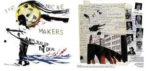 (PETTIBON, RAYMOND) (NICHE MAKERS, THE). Niche Makers, The. Los Angeles: The Niche Makers, 2009. First Pressing 1/500. Record Album + Picture Sleeve. Artist's Multiple. As New/As New. One 12" black vinyl 33 1/3 album in an illustrated picture sleeve. This quirky album by Los Angeles-based combo The Niche Makers features six songs with lyrics and vocals by Raymond Pettibon ("The Road Not Taken", "Frankie", "Coattail Glide", "Plane To SF", "If A Body Could", and "Nichemaker's Theme") and music credited to Jonny Cournoyer, Bob Rokos, M.S. Garvey, Angie Featherstone, Ashley Lauren Saks, R.J. Berman, and Dustin Poulton. The jacket reproduces an original Pettibon drawing along with his illustrated lyrics, and the band portraits are by noted photographer Christopher Felver. A brand new, unplayed example of the first and only pressing limited to five hundred unnumbered copies still in the publisher's shrinkwrap, as issued. Inventory Number: 024936