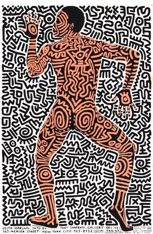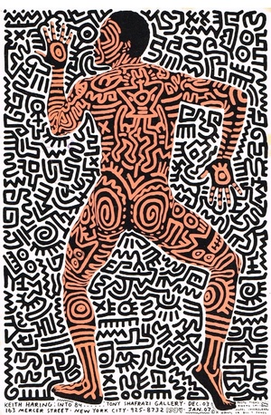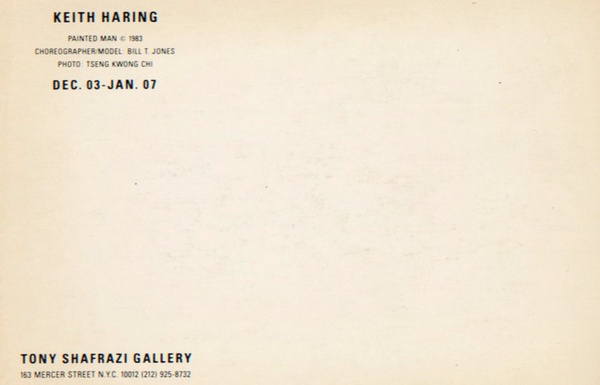 (HARING, KEITH). Haring, Keith. New York: Tony Shafrazi Gallery, 1983. First Edition. 12mo. Printed Postcard. Exhibition Announcement. Near Fine.. SOLD IN EITHER 2021 OR 2022 BUT NOT ATTACHED TO INVOICE! One 6 x 4" postcard printed offset recto and verso, 1 duotone illustration. Designed by Keith Haring. This is the striking postcard announcement published in conjunction with Keith Haring's December 1983 Tony Shafrazi Gallery exhibition - the artist's second one man show at what had become his primary dealer. Haring's short-lived career was then in full ascent from that of an East Village Scene street artist to a rising art-star with international visibility. The face features Tseng Kwong Chi's iconic photograph of dancer Bill T. Jones' painted body collaged against a Haring-painted background, with hand lettering for the event also by the artist. A most handsome, unmailed vintage example of this exceedingly uncommon ephemeral item. Inventory Number: 025340