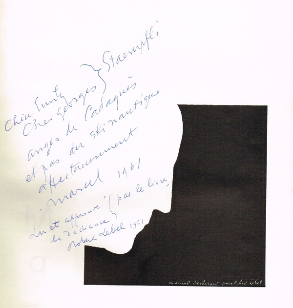 MARCEL DUCHAMP SUR ROBERT LEBEL - AN EXTRAORDINARY SIGNED ASSOCIATION COPY FROM MARCEL DUCHAMP AND ROBERT LEBEL TO GEORGES AND EMILY STAEMPFLI    (DUCHAMP, MARCEL). Lebel, Robert, Andre Breton. H.P. Roché & Marcel Duchamp. Paris: Editions Trianon, 1959. First Edition. 4to. Cloth in Illustrated Jacket. Catalogue Raisonné. Very Good -/Near Fine. 193pp, profusely illustrated in b&w and color. Designed by Marcel Duchamp. Text in French. With a bibliography. This graphically striking publication is Robert Lebel's catalogue raisonné of two hundred and seven works executed by Marcel Duchamp between 1902 and 1958 that includes a design by the pioneering Dada and Surrealist master. An internally most handsome example of the 1959 French first printing showing minor abrading to the cloth over the tips of the boards at both ends of the spine along with some mottling and light discoloration of the cloth in a bright, well preserved English language Trianon Press dust jacket housed in the publisher's unprinted chipboard slipcase bearing the BOLDLY SIGNED PRESENTATIONS "Cher Emily / Cher Georges / Staempfli / Anges de Cadaques / et pas du ski nautique / affecteusement / Marcel 1961" and "lu et apprové (pas le livre, la dedicace) / Robert Lebel 1961" in blue ink across the portrait of Duchamp on the second preliminary. Swiss-born George William Staempfli moved to New York in 1935 where he later worked for Knoedler Gallery before becoming the curator of paintings at the Museum of Fine Arts in Houston. In 1959 he and his wife Emily opened the Staempfli Gallery in Manhattan, and the following year the couple purchased a home in Cadaques, Spain where they frequently hosted their close art world friends including Salvador and Gala Dali - who the gallery showed - and Marcel and Teeny Duchamp. Inventory Number: 025647