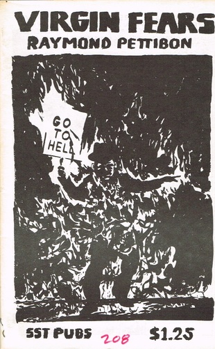 (PETTIBON, RAYMOND). Pettibon, Raymond. Lawndale, CA: SST Publications, 1983. First Edition 1/500. 8vo. Stapled Illustrated Wrappers. Artist's Book. Fine.. np (32pp), 28 b&w illustrations. In a protective clear acetate dustwrapper. Raymond Pettibon first came to prominence during the late-seventies with his raw, literary-inflected imagery for Black Flag, Sonic Youth, and SST Records. Over the subsequent decades, the erstwhile Southern California artist has deservedly become an international contemporary art icon. "Limited to five hundred copies (of which some four hundred were destroyed)", "Virgin Fears" is his 1983 SST artist book cum 'zine that reproduces twenty-eight psychologically-charged drawings. A most handsome, guaranteed authentic example of this uncommon, early Pettibon tour de force (entry number nine in Uwe Koch and Roberto Ohrt's "A Catalogue Raisonné of Artists' Books by Raymond Pettibon, 1978-98") HAND NUMBERED "208" in red ink by the artist on the front cover, as issued. Inventory Number: 025692