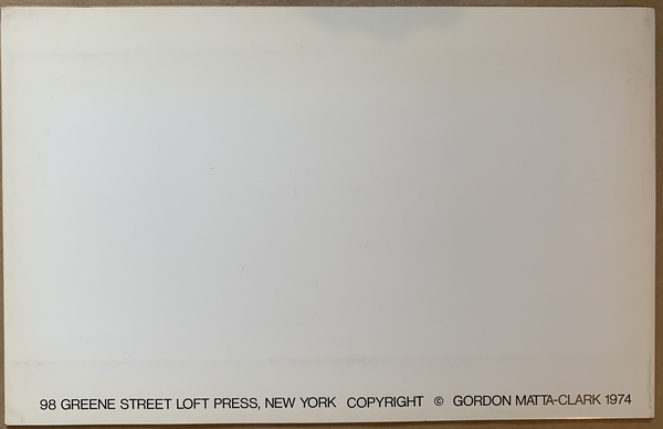 (MATTA-CLARK, GORDON). Matta-Clark, Gordon. New York: 98 Greene Street Loft Press, 1974. First Edition. Oblong 4to. Stapled Printed Wrappers. Artist's Book. Near Fine.. np (32pp), profusely illustrated in b&w. In a protective clear acetate dustwrapper. This is the influential self-published artist's book documenting Gordon Matta-Clark's now legendary 1974 chainsaw-assisted drawing and quartering of an abandoned house located at 322 Humphrey Street in Englewood, New Jersey. A handsome example of this uncommon, seminal Conceptual document whose provenance derives from Holly Solomon - Matta-Clark's primary dealer during his lifetime who along with her husband Horace purchased the Humphrey Street residence for the artist's use - showing just the slightest bit of light soiling and age-toning along the extremities. Inventory Number: 025951