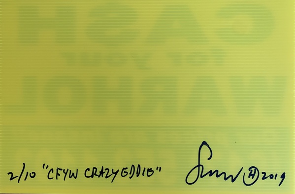 (CASH FOR YOUR WARHOL). Cash For Your Warhol, dba Geoff Hargadon. NP (Boston, MA): Cash For Your Warhol, 2019. Edition Not Stated - Presumed First. Oblong Folio. Silkscreened Plastic Sign. Artist's Multiple. As New. One 12 x 18" corrugated plastic sheet silkscreened with ink, recto only. Originally spawned from the fallout of 2008's Global Economic downturn, "Cash For Your Warhol" is Boston-based Geoff Hargadon's take on art-as-commodity, an ongoing reference to financial crisis and the ubiquitous signage that responds to it. Introduced in 2009, his CFYW signs are screen-printed on corrugated plastic, mirroring the same materials and design principles used by the anonymous forces trying to profit on misfortune in order to acquire your house, car, and diabetic test strips. Hargadon's works bear an ever-evolving variety of wry phrases commingling the realms of art and finance. They are typically posted in the dead of night in the public sphere in proximity to Art exhibitions or Fairs, and gone by the next day: their temporal presence memorialized as hundreds of images posted to social media. A brand new, pristine example acquired directly from the artist bearing the text "CASH for your WARHOL / Our prices are insane / (617) 553-1103" in black ink on a yellow substrate BOLDLY SIGNED AND DATED 2019 in black marker along the bottom edge of the verso, as issued. Inventory Number: 026219