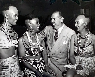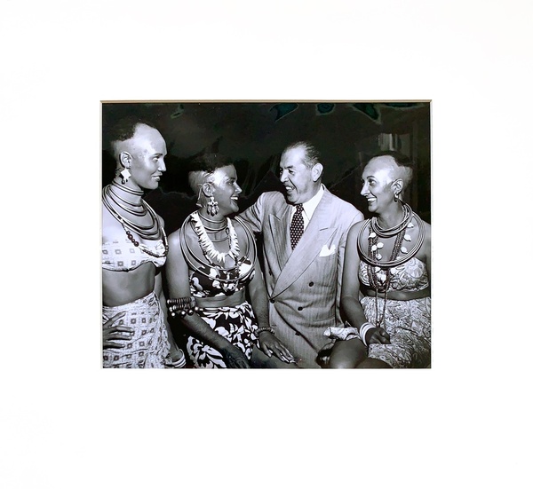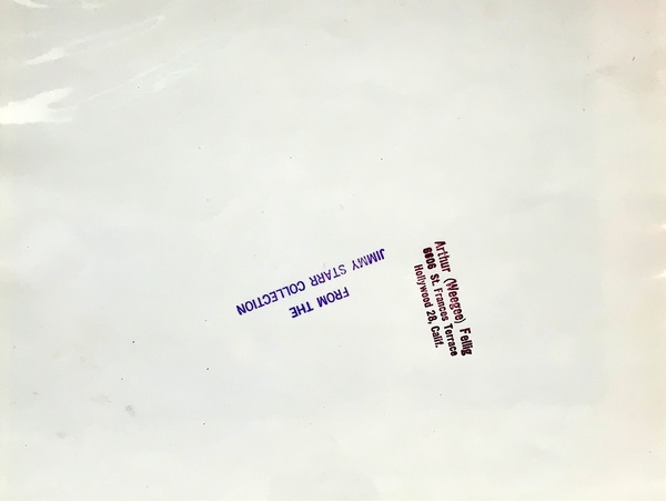 (WEEGEE). Fellig, Arthur, aka Weegee. Los Angeles. (circa 1950).: Weegee. First Edition. Oblong Folio. Silver Gelatin Photograph. Fine.. One 8 x 10" silver gelatin print printed recto only, mounted with archival photo corners in a heavy white 14 x 15 ½" beveled mat. This is a photographic portrait by Weegee "The Great" of noted Hollywood columnist, screenwriter and novelist Jimmy Starr. Starr is pictured on set laughing and enjoying the company of three actresses decked out in howlingly inauthentic outfits comprised of skull caps with wild hair, seashell necklaces, bangles, and sarongs in a culturally misguided attempt at Oceanic exoticism. Images of the actors without Starr photographed at the same sitting appear in both "Weegee's Naked Hollywood (1953)" and "Naked Hollywood: Weegee in Los Angeles (2011)". Beginning as an office boy at Metro Studios in 1919, Starr graduated to writing intertitles, dialogue, and screenplays for dozens of films in the 1920s and 1930s. His 1944 novel "The Corpse Came C.O.D." became the basis for a 1947 Columbia Pictures feature starring Joan Blondell and George Brent. Starr left studio work to write regular columns for "The Los Angeles Herald-Express", "New York Daily Mirror", and "Sunday Daily Mirror" before leaving town entirely for a successful career in Arizona with Ramada Inns. Weegee, following the success of Jules Dassin's 1948 feature "Naked City" - based on his pioneering 1945 photobook of the same title - moved to Los Angeles with the expectation of trading the late-night Manhattan crime and street photography he'd grown weary of for more lucrative process photography and cinematography jobs with the Hollywood studios. While there was some behind the scenes work along with few bit parts to be had, Weegee was primarily reliant on making distorted trick portraits of the likes of Marilyn Monroe and Jayne Mansfield to sell to magazines to make ends meet. In late 1951, newly-divorced he returned to New York where he remained active until his passing in 1968. A bright, fine condition vintage silver gelatin print on single weight glossy paper bearing the stamps "Arthur (Weegee) Fellig / 6606 St. Frances Terrace / Hollywood 28, Calif." in red and "FROM THE / JIMMY STARR COLLECTION" in purple ink on the verso. This was most likely a gift from Weegee to Starr, and as there was very little chance of selling this shot from the series for publication, there cannot be many - if any - other prints of this particular image in circulation. Inventory Number: 026241