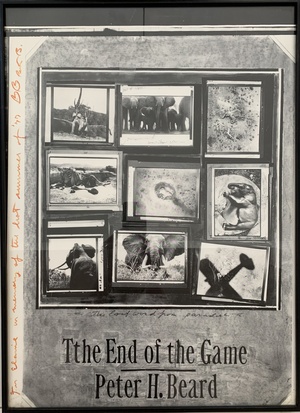 (BEARD, PETER). Beard, Peter. New York: Peter Beard, 1977. First Edition Thus. Elephant Folio. Printed Poster. Exhibition Poster. Near Fine.. One 25 x 18" heavy paper sheet printed photo-lithographically recto only, 1 illustration. Designed by Ruth Ansel and Peter Beard. This is the striking poster produced in conjunction with Peter Beard's 1977 "The End of the Game" exhibition at New York's International Center for Photography. Originally subtitled "The Last Word From Paradise: A Pictorial Documentation of the Origins, History & Prospects of The Big Game in Africa", Beard's groundbreaking first book from 1965 weaves his own photographs with vintage historical images into a narrative chronicle of the European exploration and exploitation of The Dark Continent, and the ensuing destruction of much of its native wildlife. This gripping body of work was presented twelve years afterwards at the ICP in a massive, elaborately staged installation designed by Marvin Israel. Along with hundreds of photographs, it integrated the artist's diaries, collages, animal skeletons, and more throughout the entire Fifth Avenue space. Its poster featuring a collaged array of images of Kenyan wildlife was a collaboration between Beard his "The End of the Game" graphic designer Ruth Ansel. The venue's commercially produced version measures 27 ½ x 20 ½", and includes the ICP logo in large type across the bottom edge. This however is a slightly smaller - we believe earlier - prototype variant lacking any reference to the ICP whose borders and grid of nine photographs are significantly different. Additionally, the first word in the title had been cut and pasted in the artwork to read "Tthe". A remarkably similar, yet different variant is pictured in photographs by Orin Langelle who documented the installation of the exhibition, and whose work - including images of that poster - are reproduced on the photographer's website. A most handsome example of this uncommon, unique item additionally bearing the BOLDLY SIGNED PRESENTATION "For Elaine in memory of the hot summer of '77 (two hearts) Peter B" vertically in orange crayon across the left margin. "Elaine" is Elaine Kaufman - the late, legendarily feisty proprietor of fabled Manhattan bar and eatery "Elaine's". The opening scene of Woody Allen's "Manhattan" was filmed there, Billy Joel name-checked it in "Big Shot", and the list of bold-faced names that favored her watering hole from the sixties through the new millennium reads as a virtual who's who of the New York literary, entertainment, and cultural elite. Woody, Andy, Truman, Jack, Jackie O., and Beard - known for his love of nightlife - were regulars for whom Elaine reserved her best tables each evening. The inscription refers to the record-breaking July 1977 heatwave that spawned New York's great blackout and "The Summer of (the Son of) Sam". The poster is still housed in its slightly weathered vintage black wooden frame with a glass face (from the still-extant Bark Frameworks on Wooster Street) that adorned the restaurant's memorabilia-cluttered walls for more than thirty years. Boasting impeccable provenance, this remarkable object was acquired in 2011 at the New York auction of Ms. Kaufman's personal belongings and "Elaine's" keepsakes following her death in 2010. PLEASE NOTE: Additional shipping costs are required for this item beyond our standard rates due to its weight and value - we will inform you of the applicable amount at time of purchase. 0-87701-521-X Inventory Number: 026361
