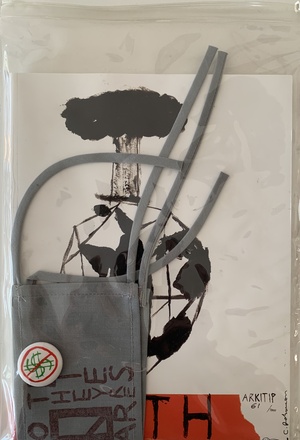 (JOHANSON, CHRIS) (ARKITIP). Johanson, Chris & Arkitip. Los Angeles: Arkitip, 2004. First Edition #61/1000. 4to. Illustrated Wrappers in a Bag. Periodical. Fine.. 128pp, profusely illustrated in b&w. Cover by Chris Johanson. This twenty-second installment of the stylish Los Angeles-based skate and graffiti graphics magazine "Arkitip" features a cover and sixteen page editorial feature with artist Chris Johanson. The rest of the issue contains contributions by Brendan Fowler, BARR, Brian Gattas, Kevin Devine, Ross Holden, Robin Nishio and Eric Baldwin, A. Ross, Dave LaMorte, Nate Cordero, Nate Williams, Witold Riedel, Nike x Undefeated x Kaws, Michael Leon, Matthew Salacuse, and others. A brand new, most handsome NUMBERED (61/1000) example from the edition of one thousand copies in the publisher's archival Arkitip clear plastic pouch with slide closure packaged with a protest armband and pin-back button designed by Chris Johanson specifically for issue 0022, as issued. Inventory Number: 026413