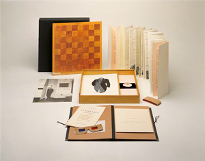 (DUCHAMP, MARCEL). Duchamp, Marcel, Andre Breton & Arturo Schwarz. Antwerp, BELGIUM: Ronny Van de Velde, 1991. First Edition #715/850 Deluxe. Square Folio. Wooden Chessboard in Slipcase. Artist Monograph. Fine/No Jacket - As Issued. Various loose components housed in a facsimile 14 ½ x 14 ½ x 2 ¼" wooden chessboard in an unprinted black cloth-over-cardstock slipcase. Text in English. This luxe object was produced in conjunction with a significant 1991 Marcel Duchamp exhibition held at Ronny Van de Velde in Antwerp. The contents are: 1. a fiberboard volume containing reproductions of numerous Duchamp-related photographs and documents including a printed facsimile of H. Vuibert's "Les Anaglyphes Geometriques", Paris, Librairie Vuibert, 1912 (with 3D-glasses), plus a reproduction of a leaf from "The Blind Man No. 2 (P.B.T.)", 2. a original volume in wrappers containing articles on the artist by Andre Breton and Arturo Schwarz, with a loosely inserted reproduction of "Le Grand Verre", 3. an audio cassette of Duchamp's 1959 interview with Richard Hamilton along with his 1967 reading of "The Creative Act" housed in a plastic case with a miniature silicon reproduction of his "Priere a Toucher", 4. a giant leporello exhibition checklist cum catalogue detailing the one hundred and fifty-one works exhibited, and 5. the colophon with a postcard reproduction of "Marcel Duchamp at the age Eighty-Five" for "View"'s special Marcel Duchamp number laid in. A brand new, most handsome example of this elaborate, uncommon offering limited to eight hundred and fifty NUMBERED (715/850) copies in the publisher's hand-tooled wooden box - a facsimile of Marcel Duchamp's "Mental" Chess Board, black slipcase, and unprinted cardboard shipping box, as issued. Inventory Number: 026434