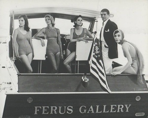 (FERUS GALLERY). Gagosian Gallery. New York: Gagosian Gallery, 2002. First Edition. Small Oblong 4to. Printed Paper. Exhibition Announcement. Fine.. One 8 x 10" sheet of thick cardstock printed offset recto and verso, 1 b&w illustration. Designed by Bruce Mau Design Inc. This is the stylish invitation/announcement card produced for the monumental 2002 Gagosian Gallery exhibition of forty-four artworks celebrating Ed Kienholz and Walter Hopps' visionary Ferus Gallery. It reproduces full-bleed the 1960 William Claxton image of a dashing Irving Blum aboard the good ship "Ferus Gallery" surrounded by a bevy of fetching models that includes Peggy (Mrs. Claxton) Moffitt. The exhibiting artists were John Altoon, Larry Bell, Billy Al Bengston, Wallace Berman, Bruce Conner, Jay DeFeo, Richard Diebenkorn, Robert Irwin, Jasper Johns, Donald Judd, Craig Kauffman, Ellsworth Kelly, Edward Kienholz, Roy Lichtenstein, Ed Moses, Kenneth Price, Edward Ruscha, Kurt Schwitters, Hassel Smith, Frank Stella, and Andy Warhol. A brand new, most handsome example of this uncommon ephemeral item - not to be confused with the exhibition catalogue for the same show. Inventory Number: 026438