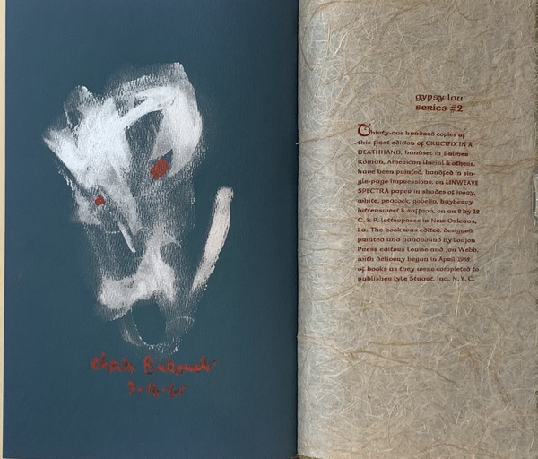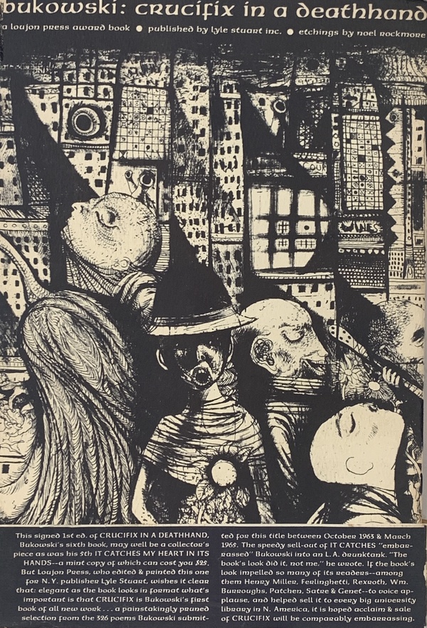 (BUKOWSKI, CHARLES). Bukowski, Charles & Noel Rockmore. New York & New Orleans: Lyle Stuart Inc. & The Loujon Press, 1965. First Edition 1/3100. Tall 4to. Illustrated Wrappers. Poetry Monograph. Very Good./Very Good -.. 101pp. illustrated in b&w + b&w covers. With 4 b&w etchings bound in. In a protective clear acetate dustwrapper. "Crucifix in a Deathhand" is the elaborately designed and bound 1965 collection of poetry by hard-living Angeleno Charles Bukowski fabricated by Louise "Gypsy Lou" and Jon Webb at their Loujon Press in New Orleans, and published with the imprint of Lyle Stuart. The author's sixth book, it was issued as a "Loujon Press Award Book" (Gypsy Lou Series #2). Printed by hand-letterpress on seven shades of heavy Spectra Linweave paper with deckle edges and elaborately bound by the Press, it includes four black and white etchings with tissue overlays by New Orleans-based artist Noel Rockmore. An internally bright, most handsome example of this tour de force (a deluxe-but-unnumbered, uncatalogued variant of entry sixteen in Aaron Krumhansel's "A Descriptive Bibliography of the Primary Publications of Charles Bukowski") limited to three thousand, one hundred unnumbered copies SIGNED AND DATED "Charles Bukowski / 3-16-65" in red acrylic paint at the time of publication beneath a striking ACRYLIC PAINTING in silver and red on the verso of a blank page at the rear. There is very light soiling and wear to the top and bottom edges of the textblock, and its Noel Rockmore-illustrated covers shows mild wear, creasing, fraying, and age-toning to the extremities. The publisher's printed wraparound band is complete and present, though it has a clean separation and is somewhat worn, torn, and age-toned. Additionally laid in is a vintage xerox of Ormonde Plater's nine-paragraph interview with Jon Webb about the book's publication captioned "Tough Poems" from the May 28th, 1965 issue of New Orleans' "Vieux Carre Courier". All in all, this is a most desirable example of an important early Bukowski title with an impressive painting that looks nicer in hand than it describes. Inventory Number: 026504