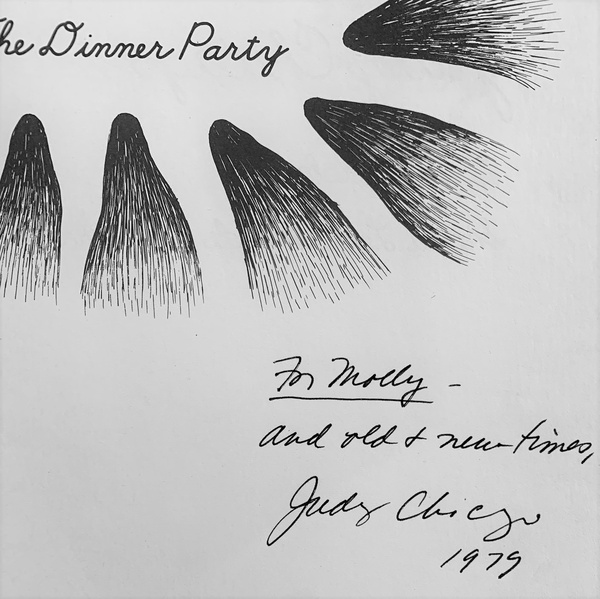 THE DINNER PARTY: A SYMBOL OF OUR HERITAGE - WITH A SIGNED PRESENTATION FROM JUDY CHICAGO    (CHICAGO, JUDY). Chicago, Judy. New York: Anchor Books, 1979. First Paperback Edition. 4to. Illustrated Wrappers. Artist Monograph. Very Good.. 256pp, profusely illustrated in b&w and color. Designed by Sheila Levrant de Bretteville. This is the comprehensive, self-illustrated 1979 monograph detailing the history and execution of Judy Chicago's iconic monumental installation devoted to the cultural achievements of women, "The Dinner Party". A handsome example of the first paperbound edition additionally BOLDLY INSCRIBED "For Molly - / and old + new times, / Judy Chicago / 1979" in the year of publication in blue ink on the half title page to noted a Los Angeles gallerist - from whom we acquired this directly - showing some light wear and handling to the covers and creasing along the spine. 0-385-14567-5 Inventory Number: 026550