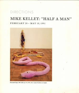 MIKE KELLEY: HALF A MAN (DIRECTIONS)  (KELLEY, MIKE). Cruz, Amanda. Washington, D.C.: Hirshhorn Museum and Sculpture Garden, 1991. First Edition. Small 4to. Pictorial Wrappers. Artist Monograph. Fine.. One 9 x 22" glossy cardstock sheet folded in thirds to make 9 x 7 ¾", 6pp, 2 color and 2 b&w illustrations. With a biography, exhibition and performance history, bibliography and exhibition checklist. This is the slender six page brochure cum catalogue published in conjunction with Mike Kelley's 1992 installation of stuffed animals entitled "Half a Man" held at Washington D.C.'s Hirshhorn Museum and Sculpture Garden as part of their "Directions" series. A brnd new, most handsome example of this uncommon ephemeral item - only ten copies are currently cited in OCLC WorldCat - that was the only printed documentation of the exhibition. Inventory Number: 026868