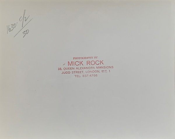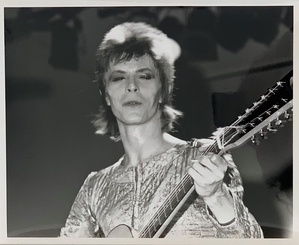 (BOWIE, DAVID) (ROCK, MICK). Rock, Mick. London: Mick Rock Studio, 1972. First Printing. 4to. Silver Gelatin Photograph. Fine.. One 8 x 10" black and white silver gelatin photographic print on glossy, single-weight paper. This is a vintage photograph by Mick Rock of the late, great David Bowie onstage at London's Rainbow Theatre in August 1972 - the shows during which the iconic performer premiered "The Rise and Fall of Ziggy Stardust and the Spiders From Mars". He is pictured wearing one of several quilted bodysuits Freddie Burretti designed for Bowie's Ziggy persona with closed eyes playing an acoustic twelve-string guitar. This print bears a "Photography by MICK ROCK" studio stamp in red ink on the verso, and was acquired by me personally from the renowned photographer in October 1972 when he was in Los Angeles documenting Bowie's two shows at The Santa Monica Civic Auditorium. A bright, most handsome example. Inventory Number: 026897