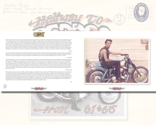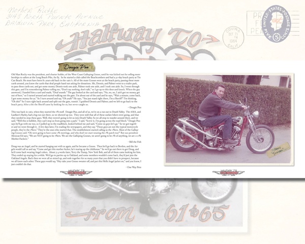 Foster, Marilyn Ruthe, aka "Mother Ruthe". Bo Bushnell & Nicholas Luciani, Editors. NP: The Western Empire, 2017. Second Edition. Oblong 4to. Pictorial Wrappers. Photographic Album. Fine.. np (144pp), 70 color illustrations + b&w cover. Compiled by motorcycle enthusiasts Bo Bushnell and Nicholas Luciani from the photographic archives of "Mother Ruthe", "Halfway to Berdoo" totals contains seventy 5 x 7 portraits of SoCal bikers taken by Mother Ruthe between 1961 and 1965 at her Baldwin Park, California home - a halfway stop for club rides that went between Venice Beach and San Bernardino. This full color book was designed by former Hells Angel and Merry Prankster, "Gut," and the foreword was written by former Hells Angel, "Dougie Poo". Each photo is accompanied by a text about the subject by either Dougie Poo, "Beautiful Buzzard", "Bill the Fish" (former Goose), "Cannibal Willie" aka "Smitty" (former Goose), Harold (former Berdoo Angel / Mother Ruthe's ex husband), Raymond (former Straight Satan and SoCal Angel), Howard (former Venice Angel), "Raunchy Pat" (Mother Ruthe's ex boyfriend), "Red Head Bev" (Mother Ruthe's former best friend), and many more people who were around back then.". A brand new, most handsome example of the uncommon - only a single copy is currently cited in OCLC WorldCat - paperbound 2017 second printing of this amazing document. 0-692-99521-8 Inventory Number: 026911