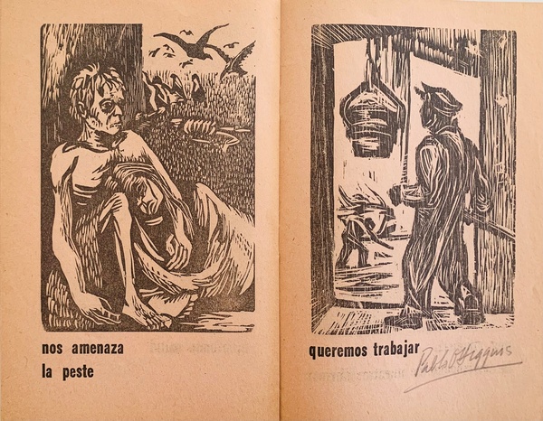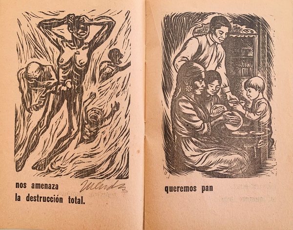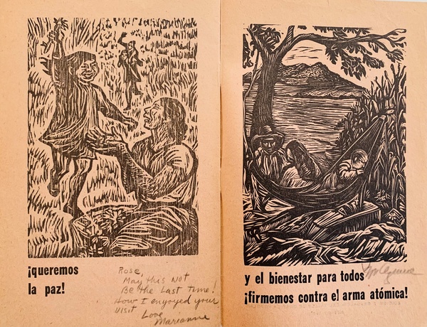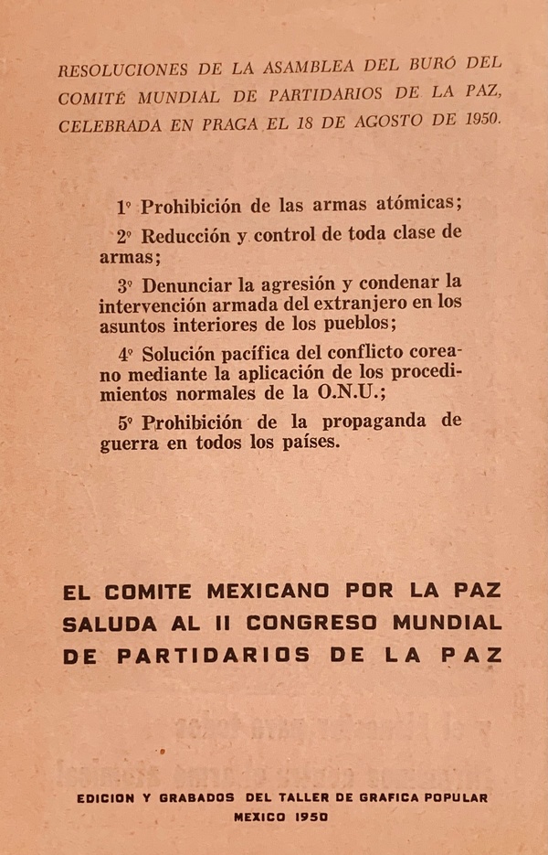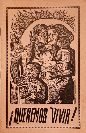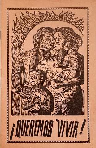 (TALLER DE GRAFICA POPULAR). Taller de Grafica Popular. Mexico City: Taller de Grafica Popular (TGP), 1950. Edition Not Stated - Presumed First. 12mo. Stapled Illustrated Wrappers. Illustrated Book. Fine.. np (18pp) , 18 black & white illustrations in woodcut + front cover. Text in Spanish. In a protective clear acetate dustwrapper. "¡Queremos Vivir!" is a lovely little 1950 pamphlet produced by the legendary Mexican Graphic Arts workshop Taller de Grafica Popular (TGP) for the Comité Mexicano por la Paz, para el Segundo Congreso Mundial por la Paz en Varsovia, Polonia. It features nineteen original woodblock prints on pale pink newsprint by TGP-affiliated artists Mariana Yampolsky, Adolfo Mexiac, Jesus Escobedo, Pablo O'Higgins, Leopoldo Mendez, Ignacio Aguirre, Guillermo Monroy, Alberto Beltrán, and Francisco Mora in support of prohibiting the testing and use of Nuclear weapons. A bright, spectacularly well-preserved example of this exceptionally uncommon - not a single copy currently appears in OCLC WorldCat - publication showing none of the chipping or fading one would expect of such a wildly fragile production (entry 800 in Helga Prignitz' "El Taller de Gráfica Popular en México 1937-1977") additionally BOLDLY SIGNED IN PENCIL by Mendez, O'Higgins, and Aguirre in the lower margin of pages bearing their prints. Mariana Yampolsky has additionally penciled the INSCRIBED PRESENTATION "Rose / May this not / Be the Last time! / How I enjoyed your / visit / Love / Marianne." Inventory Number: 026914