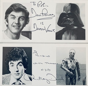 STAR WARS: TWO LUCASFILM PROMOTIONAL CARDS SIGNED BY DAN PROWSE (AS DARTH VADER) AND ANTHONY DANIELS (AS C-3PO)