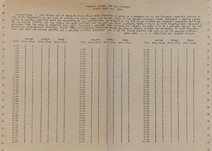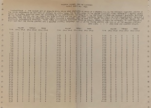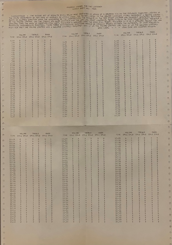 (CAGE, JOHN) (HILLER, LEJAREN). Cage, John & Lejaren Hiller. Buffalo & New York, NY: Lejaren Hiller & John Cage / Nonesuch Records, 1969. First Edition. Elephant Folio. Printed Sheet. Musical Score. Near Fine.. One 22 x 14 ½" sheet of perforated tractor-fed printer paper printed by dot matrix recto only, folded in fourths to make 11 x 7 ¼". This is the "(KNOBS) FOR THE LISTENER" instruction sheet inserted in the first Nonesuch Records 33 1/3 rpm vinyl pressing of a recorded excerpt of John Cage and Lejaren Hiller's collaborative 1969 composition "HPSCHD." It consists of a series of computer-generated output settings for Volume, Treble and Bass to be used by the listener to shape the sonic characteristics of this unique piece. "HPSCHD" received its world premiere May 16th, 1969 before an audience of over seven thousand at the University of Illinois at Champagne-Urbana, where Cage was a visiting professor at the time. The performance involved forty-eight musicians and technicians utilizing two hundred and fifty-six pieces of equipment for a duration of over four hours. For its recorded release (Nonesuch H-71224), Hiller created the "(KNOBS) FOR THE LISTENER" program on a CDC 6400 computer at SUNY, Buffalo to produce ten thousand individually-numbered instructional "scores" that uniquely alter the listener's pre-amp playback settings over the piece's duration. A well-preserved, complete and intact sheet NUMBERED 337 with its tractor-feed margins still attached folded by the publisher in fourths, as issued, offered by itself - separate from the album - showing a bit of age-toning. This is accompanied by copies of four clipped, concurrent 1969 articles about the "HPSCHD" performance from the "New York Times", "Washington Star", "Billboard", and "Time Magazine." Inventory Number: 026960