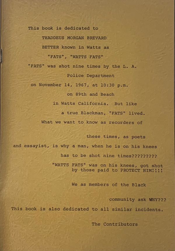 Troupe, Quincy, Editor. NP (Los Angeles): The House of Respect, 1968. First Edition. 8vo. Stapled Illustrated Wrappers. Literary Anthology. Fine.. 94pp, 1 b&w cover illustration. With contributors' biographies. Born out of the ashes of Los Angeles' 1965 Watts Riots, the Watts Writers Workshop was co-founded by Budd Schulberg, and "composed primarily of young African Americans in Watts and the surrounding neighborhoods. Early on, the Workshop included a theatrical component and one of the founders was the actor Yaphet Kotto. The group expanded its facilities and activities over the next several years with funding from the Rockefeller Foundation. Government files later revealed that the Workshop had been the target of covert operations by the FBI. Writers involved in the Workshop include Quincy Troupe, Johnie Scott, Eric Priestley, Ojenke, Herbert Simmons, and Wanda Coleman, as well as the poetry group Watts Prophets." In 1968, future Miles Davis biographer Troupe edited and helped publish "Watts Poets: A Book of New Poetry & Essays" featuring Black Nationalism-inflected contributions by Elaine Browne, Robert Bowen, a nascent Stanley Crouch, Pamela Donegan, Emmery Evans, Fanita, Lance Jeffers, Lino, k. curtis lyle, Clyde Mays, Milton McFarlane, c k moreland, Ojenke (Alvin Saxon Jr.), Blossom Powe, Eric Priestley, ridhiana, Herbert Simmons, Leumas Sirrah, Cleveland Sims, and VALLEJO. A bright, most handsome example of this uncommon item. LC 68-7829 Inventory Number: 027012