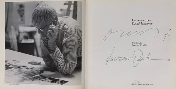 (HOCKNEY, DAVID). Weschler, Lawrence & David Hockney. New York: Alfred A. Knopf, Inc., 1984. First Edition. Large 4to. Cloth in Pictorial Dust Jacket. Artist Monograph. Near Fine/Fine. 288pp, profusely illustrated in color. Designed by Arnell / Bickford Associates. This is the opulent, oversized 1984 hardbound publication surveying David Hockney's early nineteen eighties photocollages. It beautifully reproduces one hundred and seventeen of these innovative "Cameraworks" accompanied by Lawrence Weschler's incisive essay entitled "True to Life.". A most handsome example of this spectacular tome additionally BOLDLY SIGNED "David H." and "Lawrence Weschler" by the artist and author in black ink on the title page showing a bit of light soiling along the bottom edge. 0-394-53733-5 Inventory Number: 027045