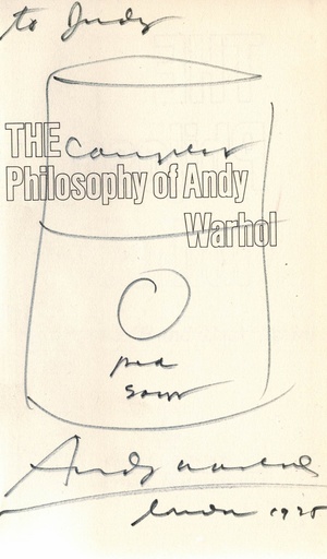 (WARHOL, ANDY). Warhol, Andy. London: Cassell London / A Michael Dempsey Book, 1975. First British Edition. 8vo. Cloth Over Boards in Jacket. Artist Autobiography. Fine/Near Fine. 242pp, no illustrations. Dust jacket design by Julian Rothenstein with a photograph by David Bailey. "The Philosophy of Andy Warhol (A-B & Back Again)" is the charming 1975 confessional autobiography cum successful artist's instruction manual penned by Andy Warhol with the assistance of Pat Hackett, Brigid Polk and Bob Colacello. It combines the Pop Art titan's ephemeral musings and concrete business suggestions intertwined with hilarious transcribed excerpts from his ever-present daily telephone calls. A most handsome example of the stated 1975 British first edition of this inspirational and aspirational tome additionally bearing a BOLDLY DRAWN CAMPBELL'S SPLIT PEA SOUP CAN DRAWING WITH A SIGNED AND DATED PRESENTATION "To Judy / Andy Warhol / London 1975" in the year of publication in black marker across the entire half title page. 0-86018-109-X Inventory Number: 027046