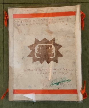 Tellez, Alfonso Garcia. Puebla, San Pablito Pahuatlan, MEXICO: Self-Published, 1975. First Edition. Small 8vo. Hand-Decorated Wrappers. Ethnographic Art Monograph. Very Good.. 28pp, 26 hand-cut paper illustrations. Text in Spanish. In a protective clear acetate dustwrapper. "Historia de la curacion de antigua de San Pablito Pahuatlan Pue[bla]" is Alfonso Garcia Tellez' 1975 handmade, holographic ethnographic study of the use of paper objects in curative and other rituals by the indigenous Otomi communities in Puebla, Mexico. Self-published by the author in Puebla, San Pablito Pahuatlan, it contains twenty-six unique, intricately hand-cut fig bark paper representations of Otomi spirit entities associated with specific illnesses tipped onto a leporello of thick, mold-made paper - each with handwritten descriptive text. The content focuses on witchcraft and curing ceremonies, including recipes for potions and poultices derived from herbs and amatl wood. A handsome example of this exceedingly uncommon - only ten copies are currently cited in OCLC WorldCat - and exceptionally striking document bound in thick wrappers with its original bright orange cloth ribbon ties bearing a cut paper image affixed to the front cover, as issued, additionally BOLDLY SIGNED BY THE AUTHOR in green ink on the front. Inventory Number: 027097
