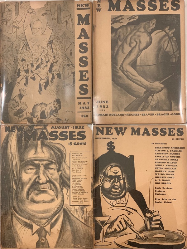 (NEW MASSES). Gold, Michael & Walt Carmon, Editors. New York. 1931-1932.: New Masses, Inc.. First Editions. 4to. Stapled Illustrated Wrappers. Socialist Periodicals. Good - or Better.. Fourteen individual issues each 22 to 30pp, profusely illustrated in b&w. In protective clear acetate dustwrappers. Beginning in 1926, "New Masses" established itself as the conscientious Depression-Era illustrated voice of Communist and Marxist-leaning American workers. The early 1930s were a particularly fertile period for it's stinging brand of graphic social critique. This run of issues begins with June of 1931, and includes July, September thru January 1932, then April, May, June, August September, November, and December. The striking covers are by Jacob Burck (4), Hugo Gellert (2), Otto Soglow (3), I. Klein, William Siegel, Ettaro (sic?), William Gropper, and Walter Steinhilber. Other notable artistic contributors here are Louis Lozowick, Art Young, Adolph Dehn, Mitchel Siporin, Phil Bard, Anton Refregier, Walter Quirt, and many others. Featured writers include Langston Hughes, John Dos Passos, Theodore Dreiser, Upton Sinclair, Agnes Smedley, and Whittaker Chambers. This is a nice run of the magazine from a significant period, with all issues complete. Due to the highly brittle newsprint, these are wildly fragile; some covers have over the course of the past ninety years detached along the spine, and many have chipped along the foredges and the upper foredge corners. Some are soiled or show a bit of light dampstaining. All are individually protected in archival clear acetate dustwrappers. All in all, this is a good looking, well-loved archive from an important period of American labor and illustration that has been priced accordingly. Inventory Number: 027110