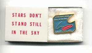 (WEINER, LAWRENCE). Weiner, Lawrence. Santa Monica, CA: Peter Norton Family Foundation, 1991. First Edition. 16mo. Artist's Multiple. As New.. This is a limited edition cloisonné pin commissioned by the Peter Norton Family Foundation in 1991 from noted conceptual practitioner Laurence Weiner for use as their annual holiday gift. More recent Norton Family editions have included objects by Takashi Murakami, Vik Muniz, Christian Marclay, Brian Eno, Kara Walker, Lorna Simpson, Yasumasa Morimura, and many others. The 1 x 1 ¼" pin bearing the text "Stars Don't Hold Still in the Sky (For Anybody)" is housed on a cotton cushion inside a 2 x 2 ¼ x 3/8" white-with-red-lettering sliding paper matchbox-style enclosure. A brand new, most handsome example of this lovely little hors commerce artist's multiple. Inventory Number: 027278