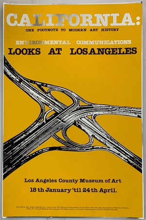 (ENVIRONMENTAL COMMUNICATIONS). Environmental Communications. Los Angeles & Venice, CA. ND (1977): Los Angeles County Museum of Art & Environmental Communications. First Edition. Folio. Printed Poster. Exhibition Poster. Near Fine.. One 20 x 13" heavy foil-coated paper sheet screenprinted recto only, 1 color illustration. Designed by Environmental Communications. This is the luxe, silkscreen-over-silver-foil-substrate poster issued by Environmental Communications in conjunction with their participation as part of the intriguing 1977 Los Angeles County Museum of Art show, "California: 5 Footnotes to Modern Art History." Their contribution was "Environmental Communications Looks at Los Angeles", a sprawling multi-media exhibition of hundreds of the free-form media cooperative's contemporary photographs of Southern California's recent architecture, murals, signage, and outdoor graphics. The Museum's catalogue included Tom Wolfe's essay on the firm entitled "Chester Gould Versus Roy Lichtenstein." A bright, shiny, most handsome example of this exceedingly uncommon poster depicting an aerial view of LA's iconic downtown freeway interchange showing a few minor nicks and scuffs. It will be mailed in a poster tube. Inventory Number: 027302