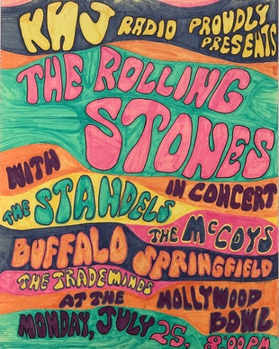NOBLE RICHARDSON: A UNIQUE, HAND PAINTED 1966 FAN ART POSTER FOR "KHJ RADIO PROUDLY PRESENTS THE ROLLING STONES, THE STANDELS (SIC), THE McCOYS, BUFFALO SPRINGFIELD, AND THE TRADEWINDS AT THE HOLLYWOOD BOWL"