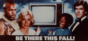 National Broadcasting Corporation (N.B.C.). NP. ND (circa 1983-86).: NP (Presumed N.B.C.). Edition Not Stated - Presumed First. Narrow Oblong Double Elephant Folio. Loose Photograph. Promotional Photograph. Very Good - .. One 12 ¼ x 26 ½" Type C color photographic print, 1 color illustration. This is a color photograph featuring a montage of a stern Mr. T., delightful Dinah Shore, the always cheerful Gary Coleman, and a smirking Pierce Brosnan in his Remington Steele tux directing the viewer’s gaze towards a television set with the caption "Be There This Fall!" Its dimensions suggest it was likely created to sway urban bus or subway riders towards the Peacock Network's Prime Time television lineup, and given the personalities depicted, this would have been between 1983 and 1986. A handsome, flat example of this mysterious vintage advertisement showing some handling indentation and a few flattened soft creases that is additionally dripping with nostalgia. Inventory Number: 027315