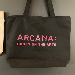 . I00250702. Our first bit of ARCANA merch! A big, strong bag with a zippered top & 6 1/2 inch square zippered inside pocket. 20″ x 15″ with a 5″ squared-off gusset and 10 1/2″ handles. Made from 12 oz. canvas and reinforced at stress points to carry even your biggest, baddest books. In black with hot pink print. Printed with love in Venice, CA by Tony Mac.
