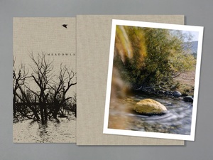 It turns out there’s plenty of space out there for even birds to disappear. Bates’ photographs are full of things disappearing in plain sight; like all photos, they’re an imposition, but given the glorious anonymity of sprawling tracts of western and plains states geography, they’re also about respectful distance, and the space(s) between people, places, and things. These are places famous for keeping their secrets, and for maintaining a (long) arm’s reach from the outside world. A person drifting in such landscapes can never be entirely sure where they are, other than simultaneously on the outskirts of everything and in the thick of a perpetual and sublime (and very quiet) mystery. Every photographer is essentially exploring outer space, but in Meadowlark Bates is in deep space, and these are photos that are as reticent as their subjects. This world doesn’t much nurture silence, but it’s still out there, a stealth force, a glacier, and in the places it lives it can hear things coming from a long way away." A brand new, most handsome example of variant "B" of the deluxe slipcased edition of this lovely volume hot off The Deadbeat Club Press limited to fifteen copies only accompanied by a signed and numbered 9 x 11" archival pigment print of the book's color image of a large rock in a stream additionally SIGNED Ian Bates in ink.