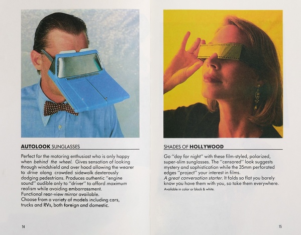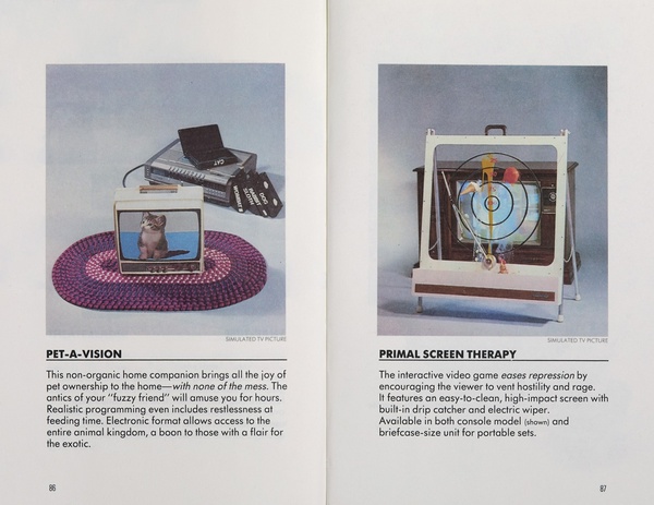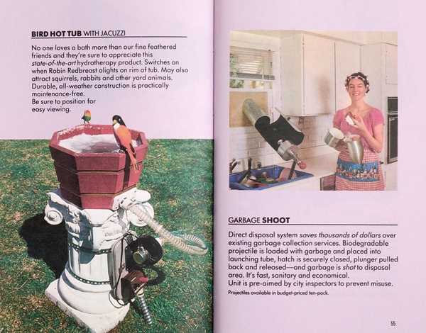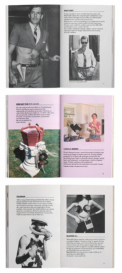 Pippa Garner’s Better Living Catalogue - originally published in 1982, takes the form of a mail order catalog featuring clever and whimsical inventions that parody consumer goods while simultaneously critiquing America’s obsession with ingenuity, efficiency, leisure, and comfort. These works, which were made as prototypes and photographed for the publication, take the form of improbable accessories, clothing, footwear, home appliances, and office gadgets. For example, the “Reactiononometer,” a portable wristband, instantly measures social success, while the “Digital Diet Loafers” display the wearer’s weight with every step. If the “Munch-o-Matic” reduces deskwork interruptions by flinging a snack right into the user’s mouth, other items promise financial solvency (the controlled cash flow “Autowallet”), sustainable waste management, or mess-free companionship (the “Pet-a-Vision” TV console). The artist asserts that all of the products in the book are “absolute necessities for contemporary survival.” Many of the prototypes Garner created for the publication were ultimately repurposed or recycled, making this previously rare gem of an artist book one of the artist’s few works to now be widely available.