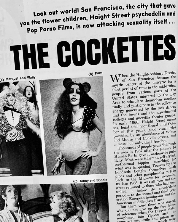The influence of the Cockettes on American underground culture is present in every glittery sequin and candy-colored coiffure gracing our daily lives. Birthed in an LSD bathed commune in San Francisco’s Haight-Ashbury district in the fall of 1969, The Cockettes were a fever dream of sexual freedom and expression. They granted themselves names and identities that reflected their inner nature then put it all on the stage with elaborate costumes in anarchic musical productions. Gay, straight, bisexual, pansexual—The Cockettes were EVERYTHING. The photos here are shared from museums, magazines, private collections, and the archives of founding and long-time Cockette, Fayette Hauser.