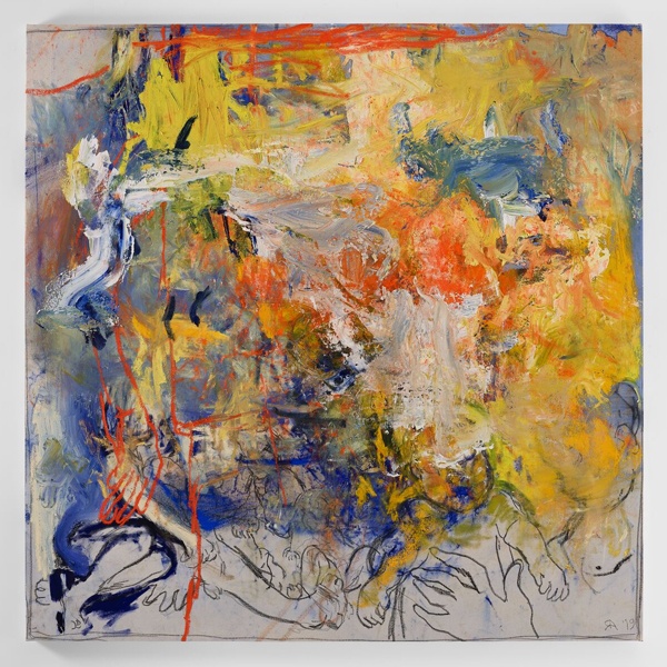 Tensions of creation and destruction in the latest paintings from Rita Ackermann, shifting between representation and abstraction
