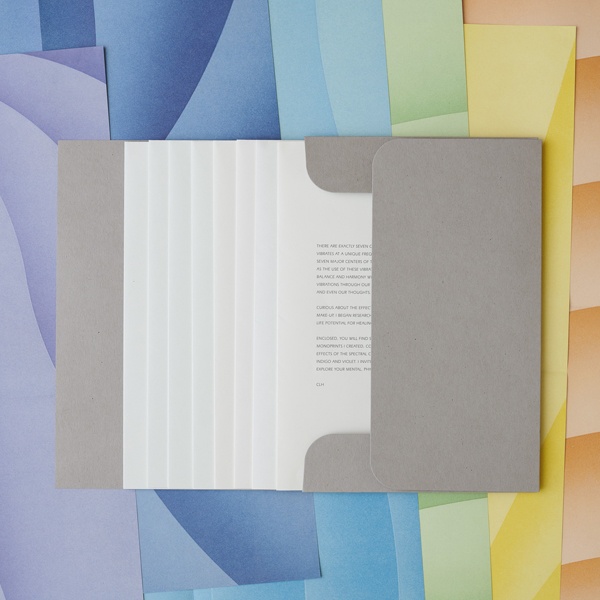 In Color: Spectral Meditations for Healing is a portfolio containing seven full scale reproductions of 16 x 23 inch monoprints by Los Angeles based artist Cheryl Humphreys.