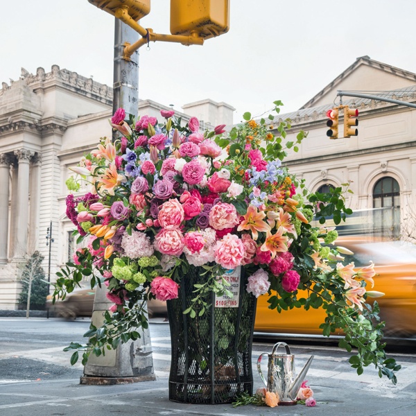 Before dawn one morning in October 2016, renowned New York-based floral designer Lewis Miller stealthily arranged hundreds of brightly colored dahlias, carnations, and mums into a psychedelic halo around the John Lennon memorial in Central Park. The spontaneous floral installation was Miller’s gift to the city—an effort to spark joy during a difficult time. Nearly five years and more than ninety Flower Flashes later, these elaborate flower bombs—bursts of jubilant blooms in trash cans, over bus canopies, on construction sites and traffic medians—have brought moments of delight and wonder to countless New Yorkers and flower lovers everywhere, and earned Miller a following of dedicated fans and the nickname the “Flower Bandit.”