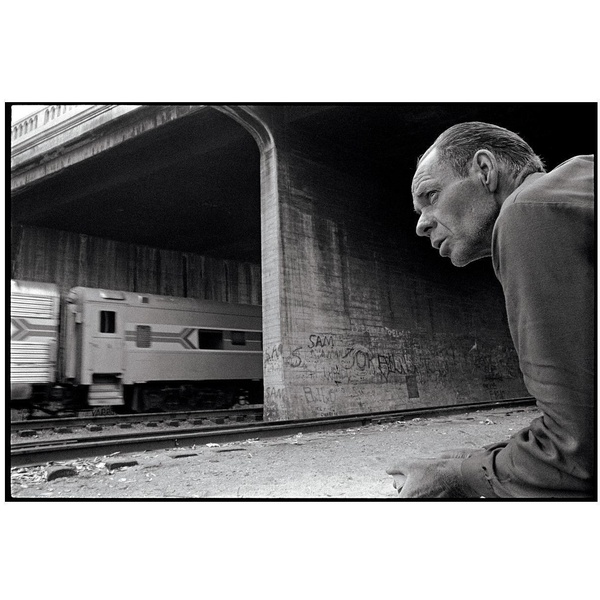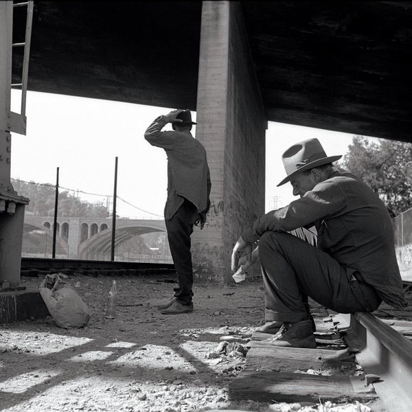 One day in 1974 John Free took his white dog Casper and his black Nikon camera to the Los Angeles Freight yards on an invite from a stranger to meet under a bridge to see "how a real tramp lives." Under that bridge he found the "Home Guard of the Taylor Yard," at the End of the Line, as far west as one could travel on trains and the best place for an old railroad tramp like shorty, Old Man PeeWee or Bobbi K, to live out their days. It's a part of Los Angeles that is now gone.